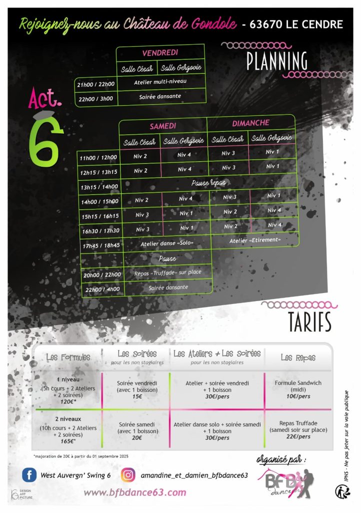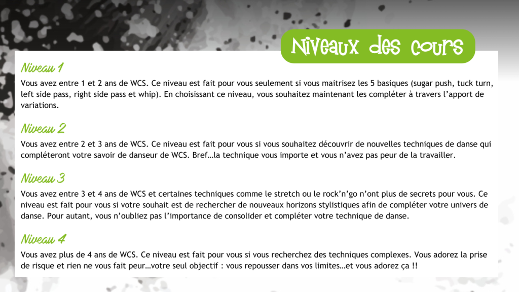2 niveaux : 10h de cours + 2 ateliers + 2 soirées = 165€