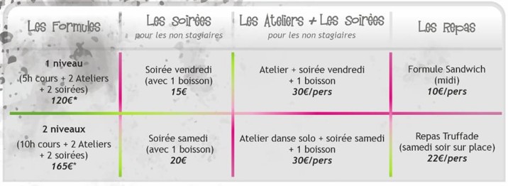 1 niveau : 5h de cours + 2 ateliers + 2 soirées = 120€