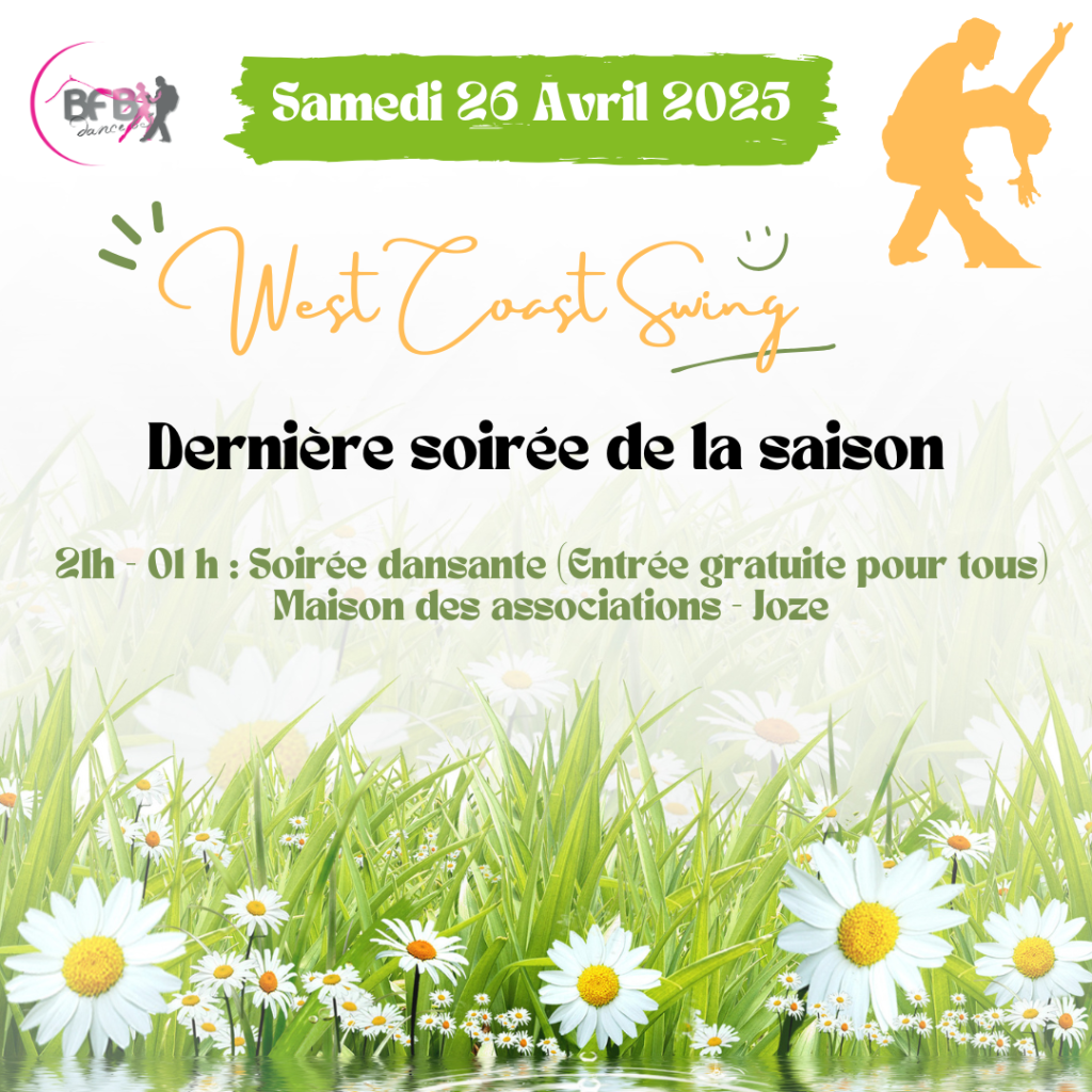 Réservez votre samedi 26 avril 2025 pour notre dernière soirée West Coast Swing de la saison ! ![]()